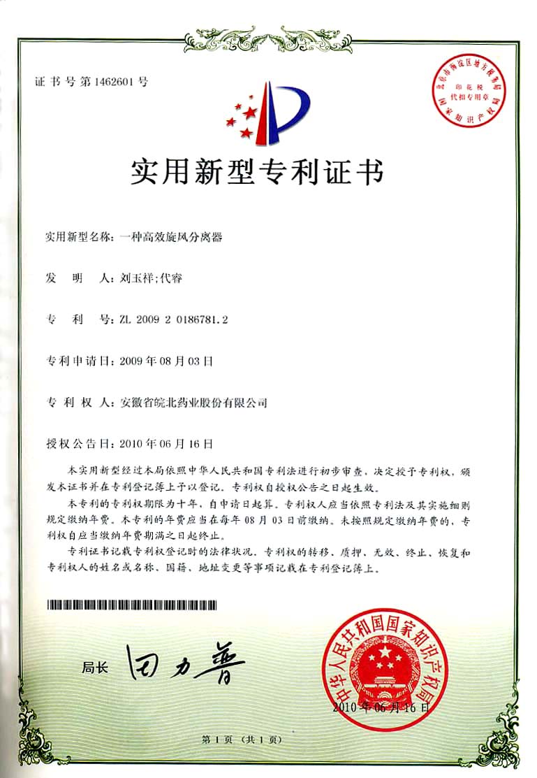 公司一种高效旋风分离器(用于发酵领域发酵罐的排气设备)被授于实用新型专利权。