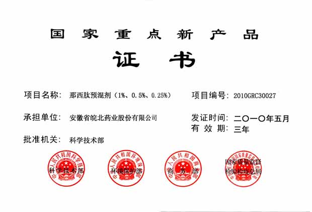 2010年6月28日, 国家科技部发布了《关于下达2010年度国家有关科技计划项目的通知》(2010年国科发计〔2010〕265号文件),公司申报的那西肽预混剂(1%、0.5%、0.25%)项目被列入2010年度国家重点新产品计划。全国1530项新产品获“国家重点新产品”证书,安徽省共60项新产品获此认证。该计划项目是由国家科技部、商务部、质量监督检验检疫总局、环境保护总局四个部门联合评审的。